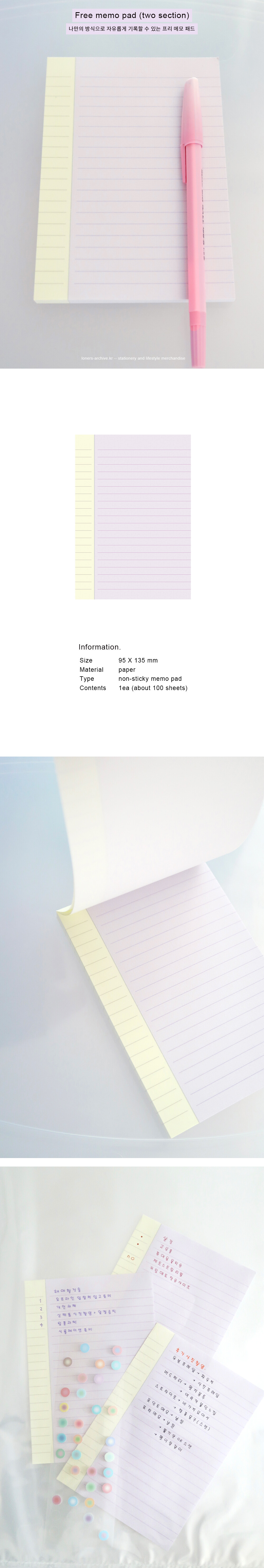 Information. Size|95 X 135 mm Material|80g paper Type|non-sticky memo pad (비접착 메모지) Binding|short edge binding (짧은쪽 상단 떡제본) Contents|1ea / about 100 sheets (1권 / 약 100매)